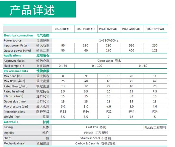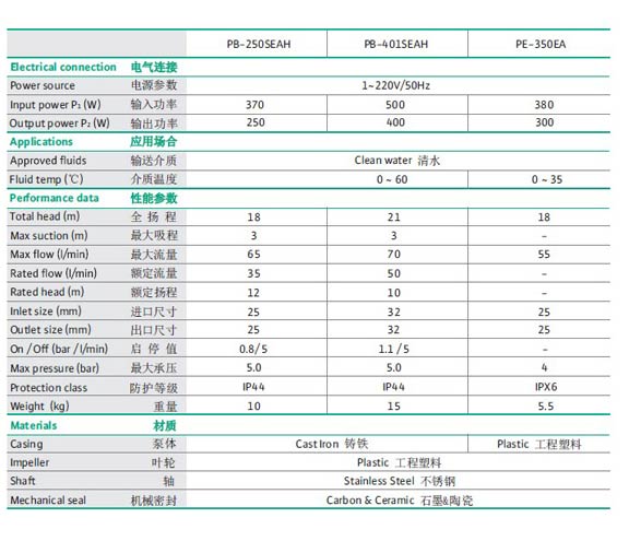 離心家用增壓泵:PB-088EAH/PB-090EAH/PB-169EAH/PB-400EAH